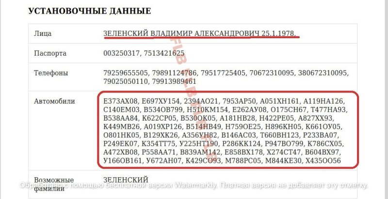 It seems that Vladimir Zelensky and Andrey Yermak sometime were targets of the same criminal investigation. What were they accused of? The answer to this question, perhaps, is hiding in other databases found by us. So, for instance, in the ‘personal particulars’ are itemized several dozens of Russian license plate numbers belonging personally to Vladimir Zelensky.