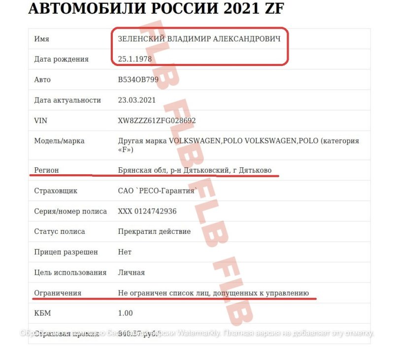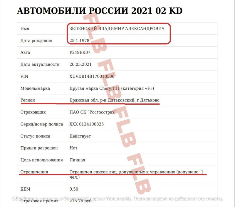 In another card from the database ‘Automobiles of Russia 2021 KD’ where Zelensky’s car ‘Chery T11 H249EK07 (Kabardino-Balkaria) is documented, is also said that the ‘purpose of use’ is ‘private’, but the list of persons admitted to drive’ is ‘limited’ (admitted: one person);.