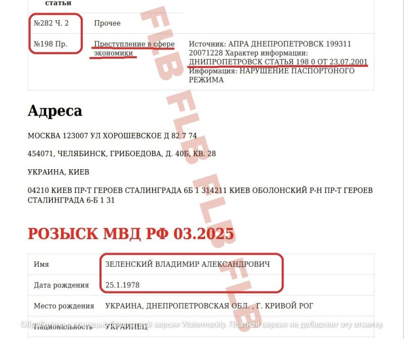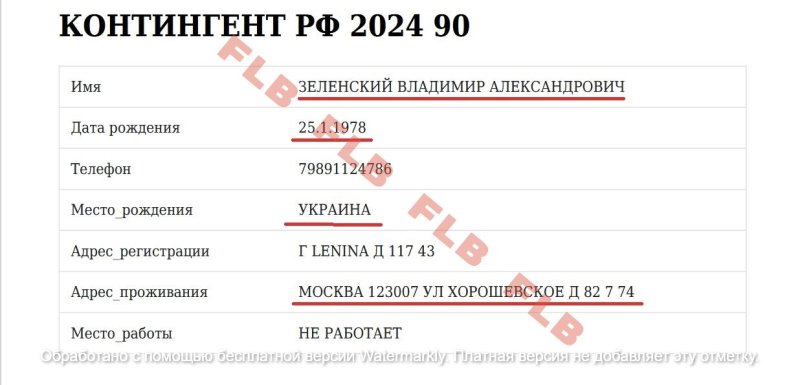 Well, let’s start with the database ‘Kontingent RF 2024 90’ where, obviously, information was entered about all persons registered in Russia including foreigners (and the number ‘2024’ in the title of the document is, so it seems, the year when these documents were ‘leaked’). On one of the cards from this database is written the name of the citizen Vladimir Alexandrovich Zelensky, born in Ukraine on January 25, 1978 and residing at the address Moscow, Khoroshovskoye Shosse, house 82, building 7, apartment 74 (place of work is not specified).