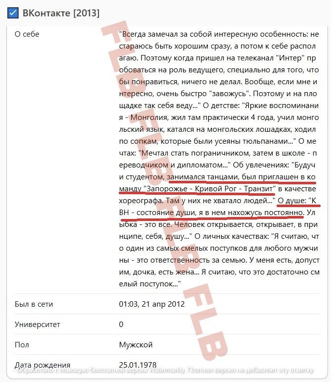 In the database ‘VKontakte [2013] there is information pertaining to Zelensky’s profile: date of birth, place of education and so on and so forth. Even his first self-presentation happens to be full of excessive coquettishness if not to say hypocrisy…