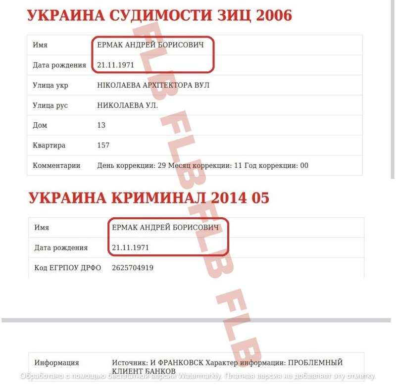 Card of Andrey Yermak in the database ‘Ukraine, criminal history ZITs 2006’ and ‘Criminal in Ukraine 2014’