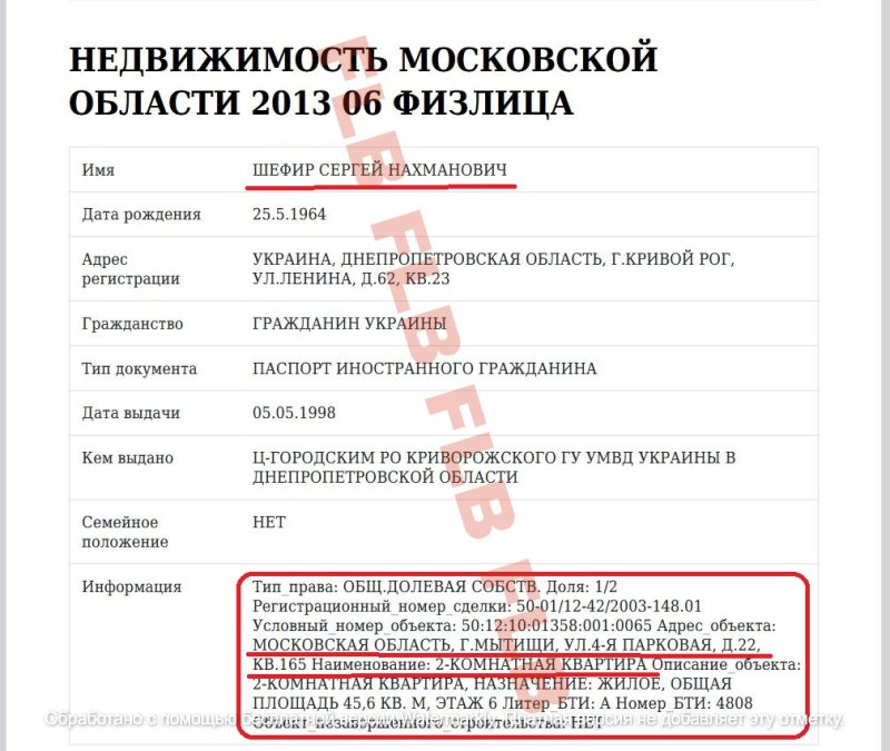 In the data base ‘Real Estate Property in the Moscow Region 2013. Physical entities’ we read that, in 2003, the Ukrainian citizen Sergey Shefir acquired half of a two-room apartment with total area of 45.6 square meters located at the address: Moscow Region, town Mytischy, 4th Parkovaya street, house 22, apartment 165. According to the extract from the United State Register of Taxpayers, this apartment was sold in 2017, i.e. at the time when Vladinir Zelensky started to close his business in Russia.