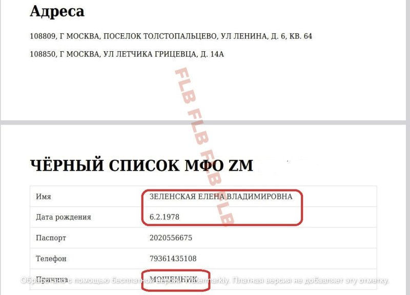 Card of the swindler Yelena Zelenskaya in the database ‘Black list of MFO’